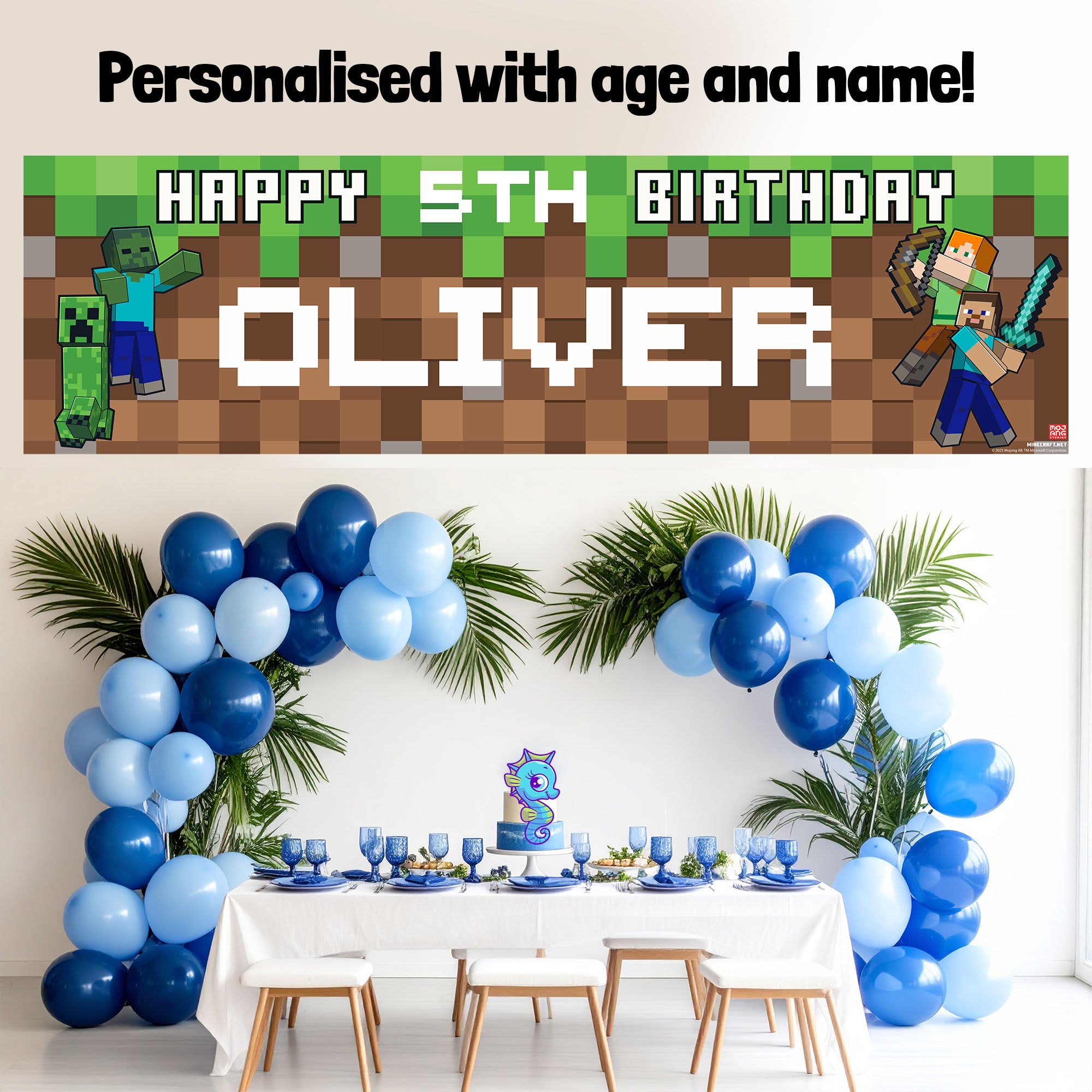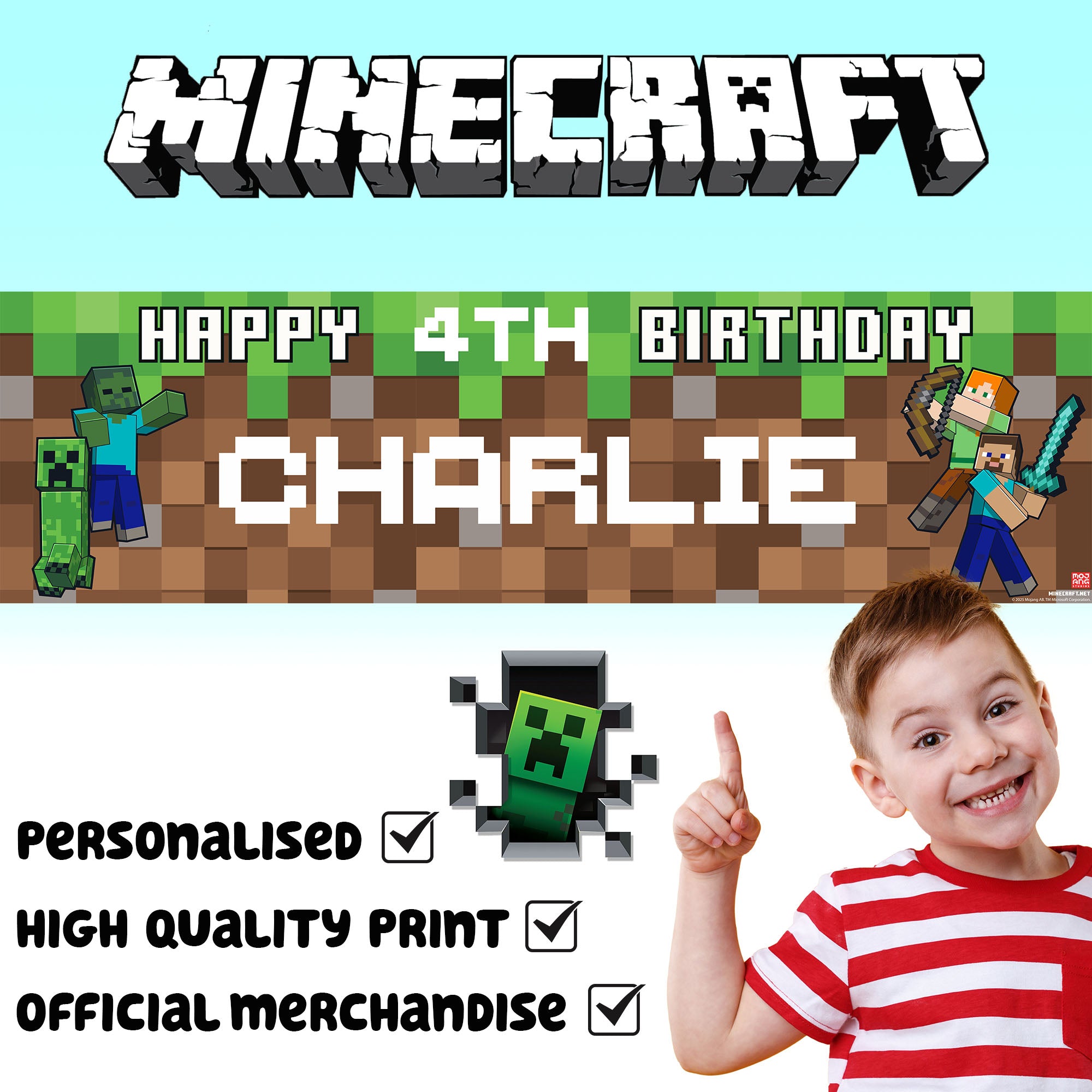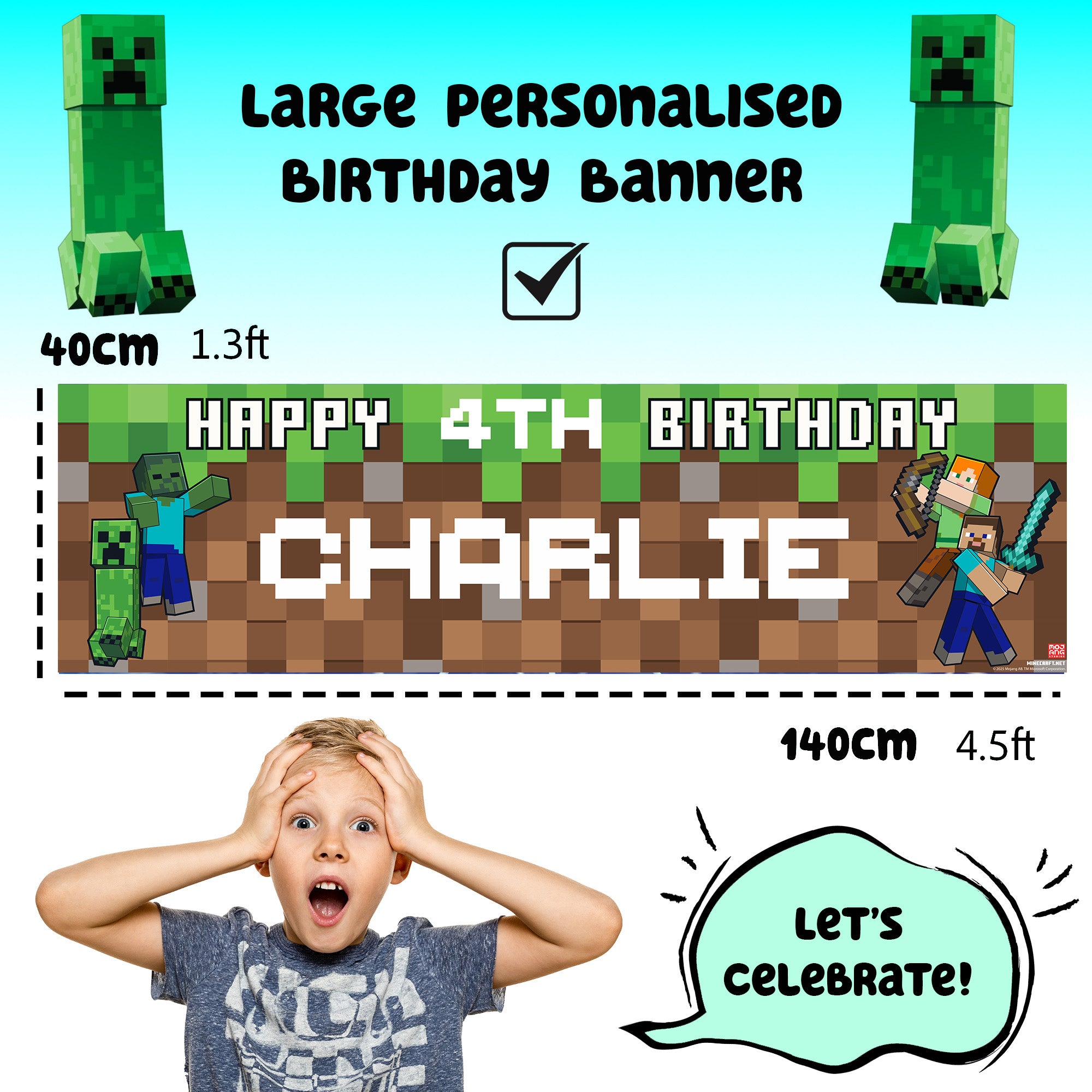 Minecraft Personalised Birthday Banner for boys – Custom Name and age Party Decoration, Large 4.5ft x 1.3ft (140cm x 40cm), Minecraft Theme Party Backdrop for Kids