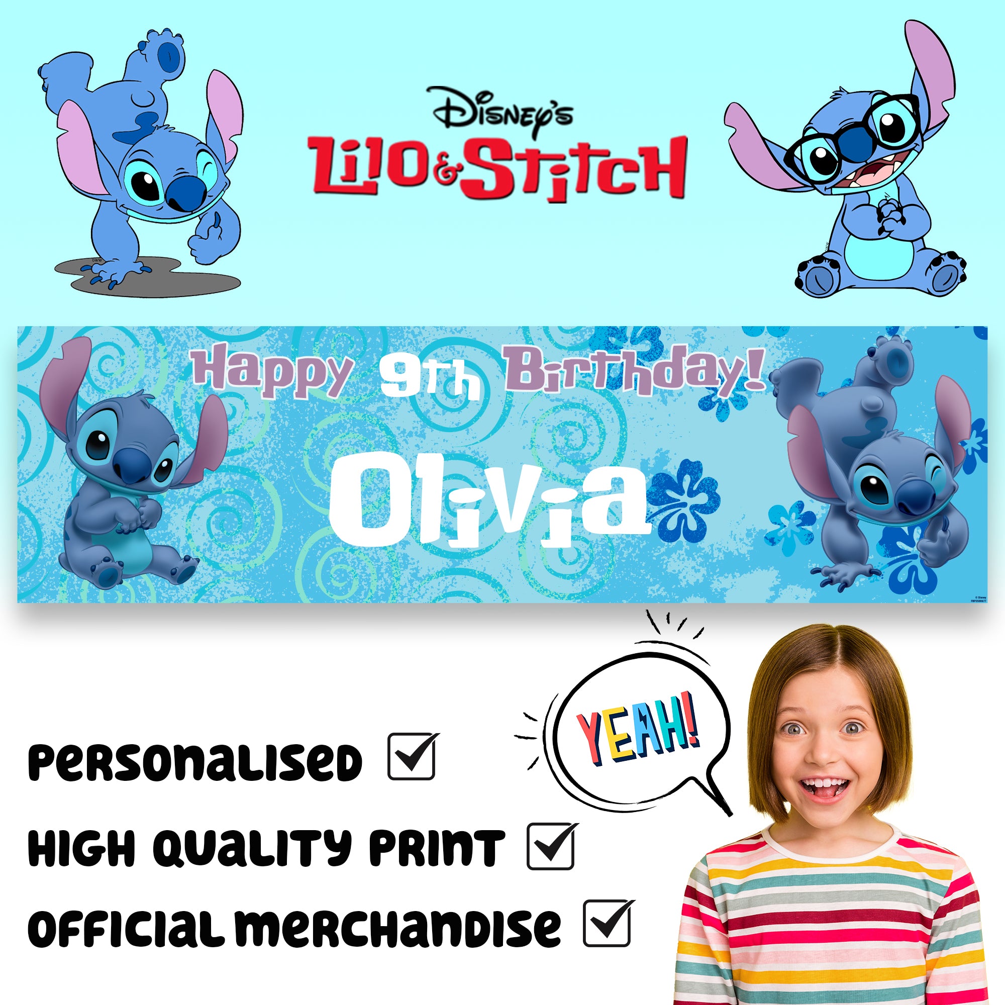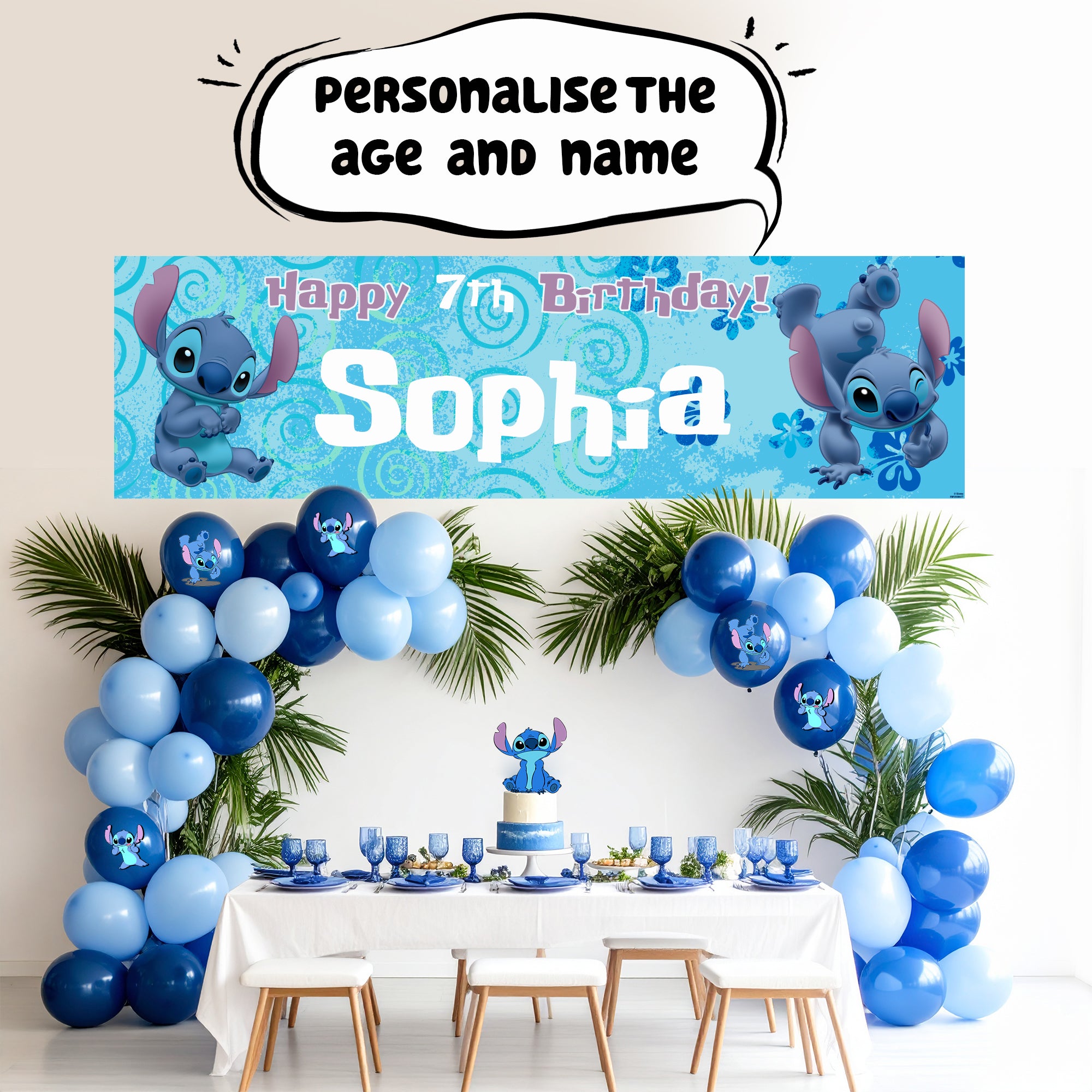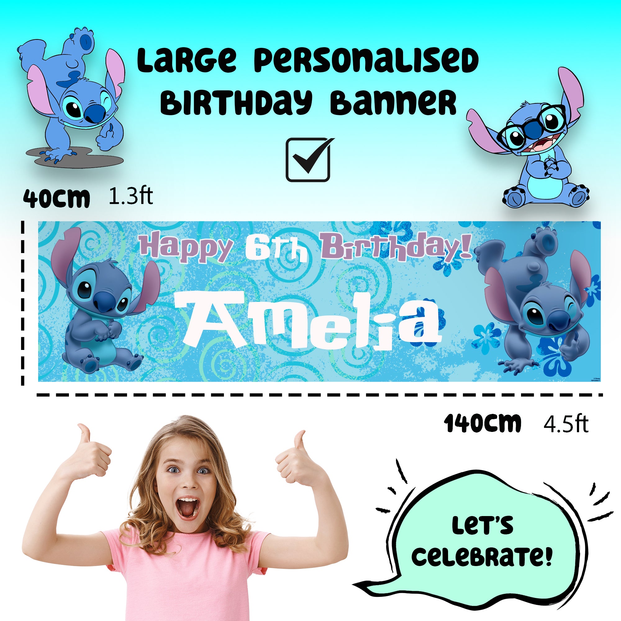 Disney Stitch Personalised Birthday Banner for Girls – Custom Name and age Party Decoration, Large 4.5ft x 1.3ft (140cm x 40cm), Stitch Theme Party Backdrop for Kids