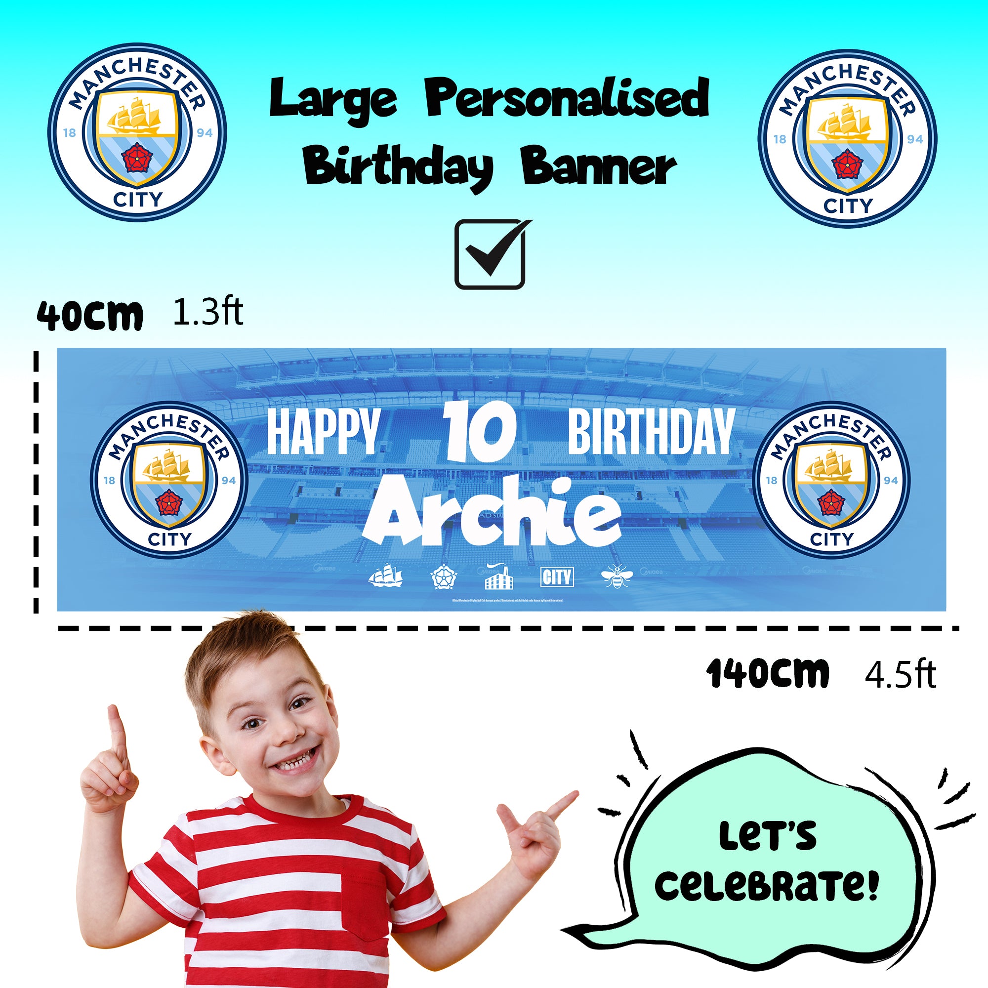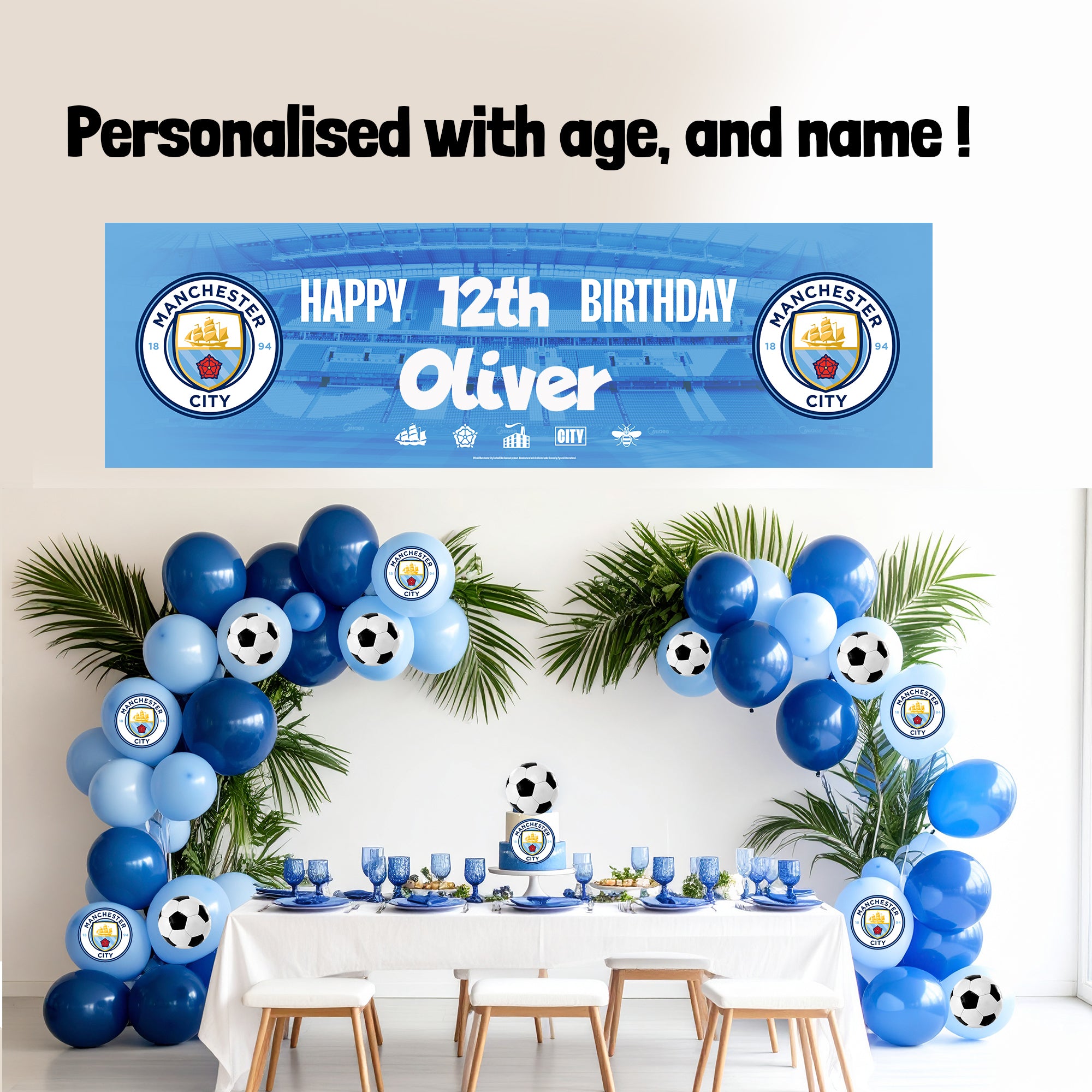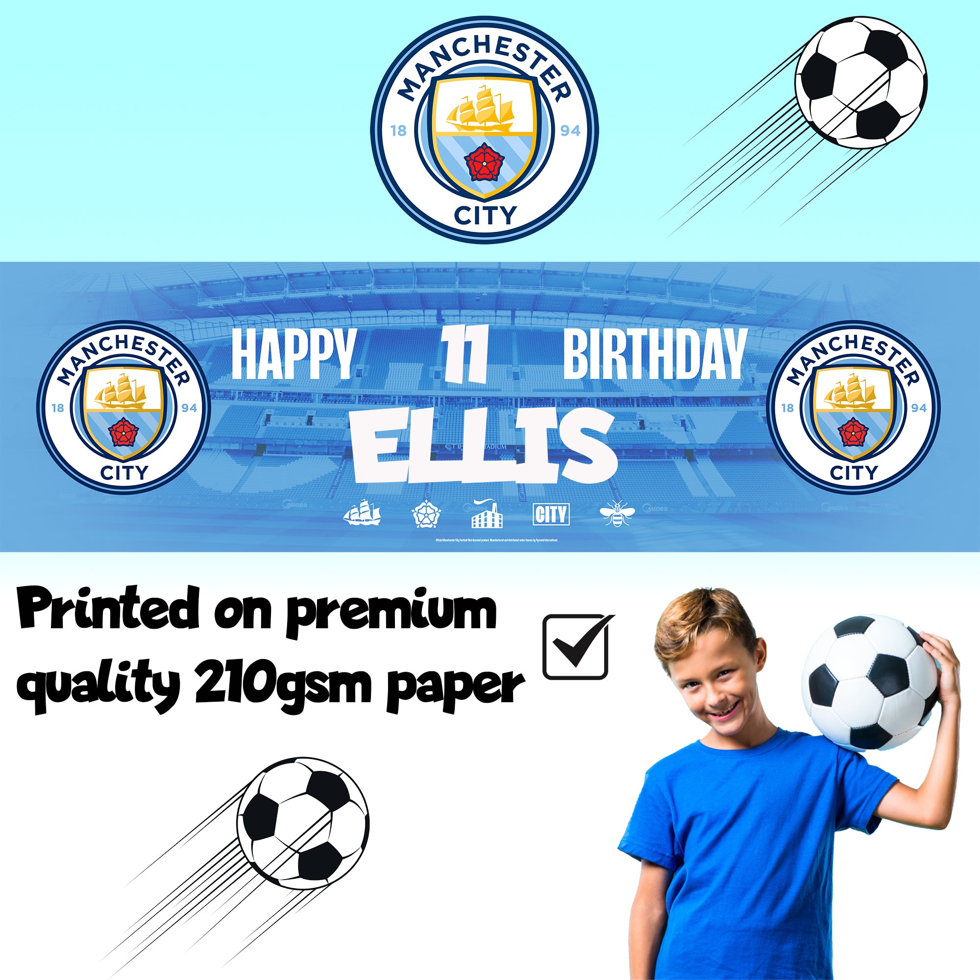 Manchester City Personalised Birthday Banner for Boys – Custom Name & Age Party Decoration Large 140 x 40 cm Football Theme Backdrop