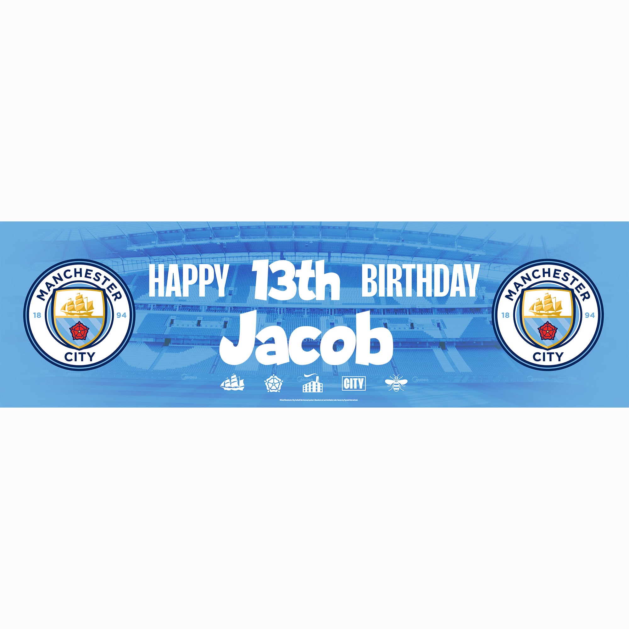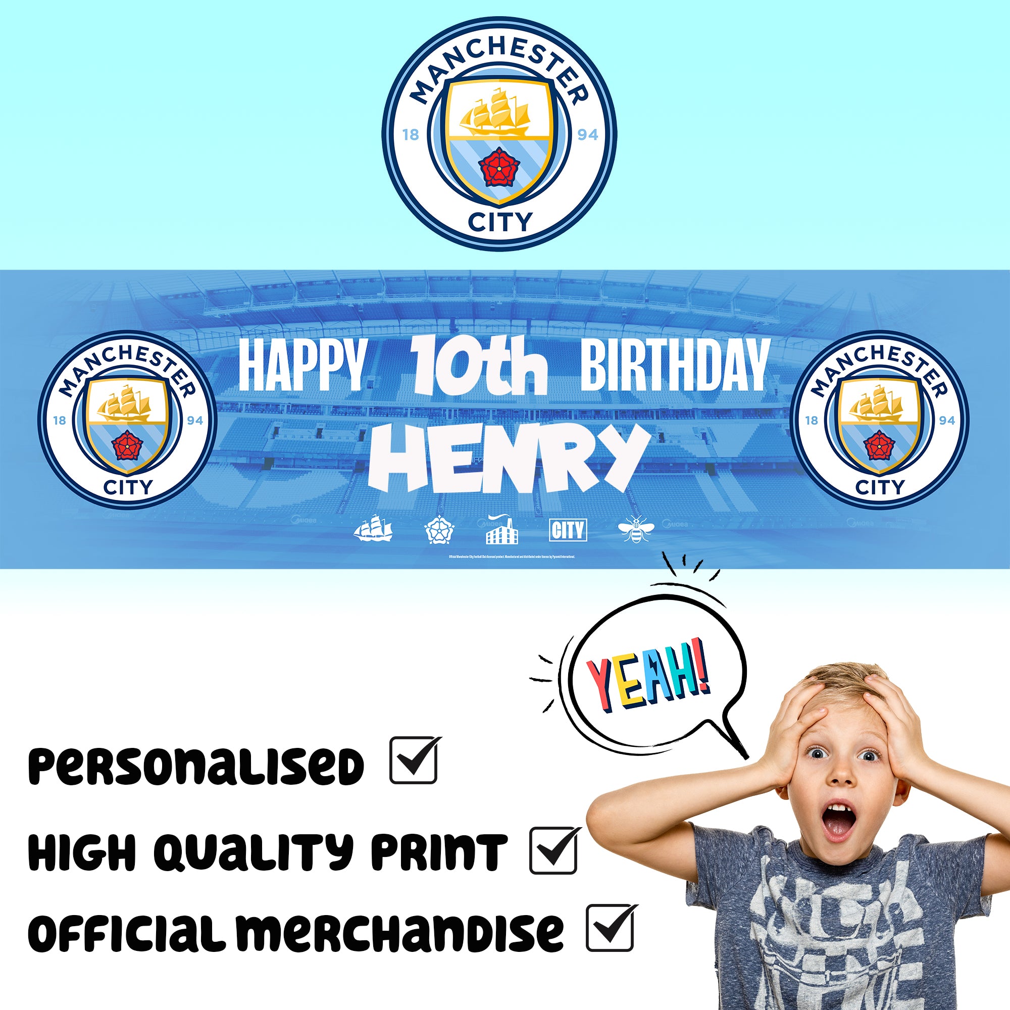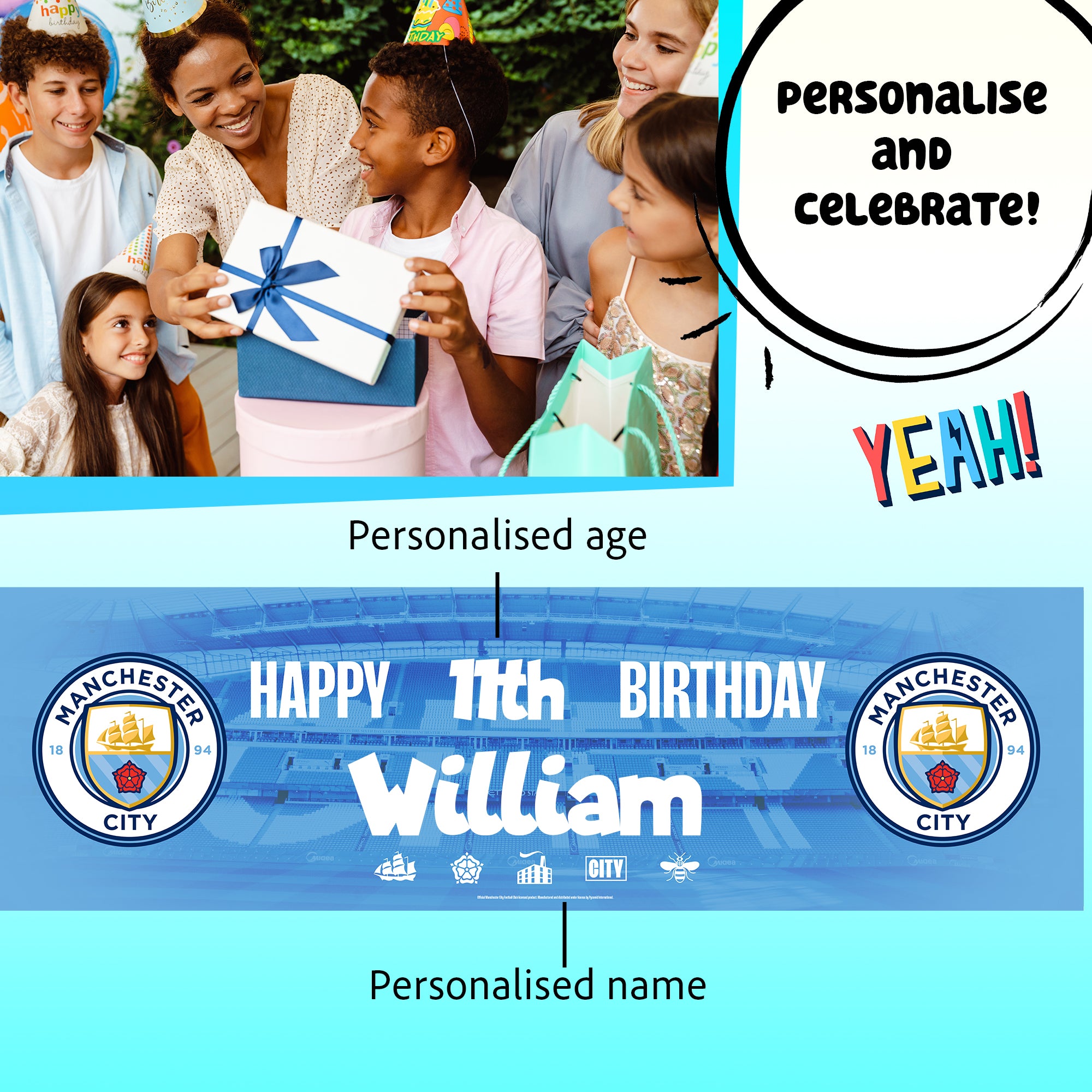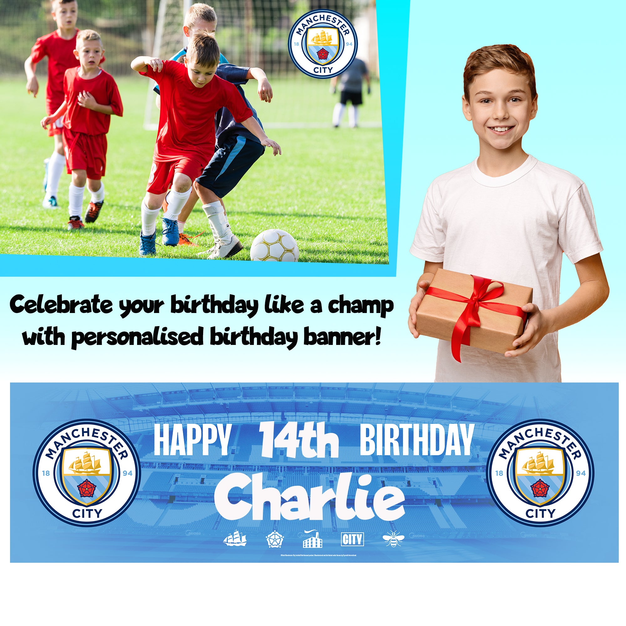 Manchester City Personalised Birthday Banner for Boys – Custom Name & Age Party Decoration Large 140 x 40 cm Football Theme Backdrop